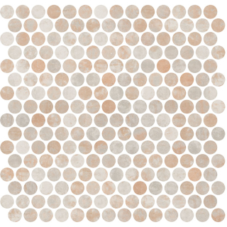 Inspired by traditional penny mosaics, each tile measures approximately coin-sized and is arranged in a seamless repeating pattern, creating a uniform yet visually dynamic surface.
